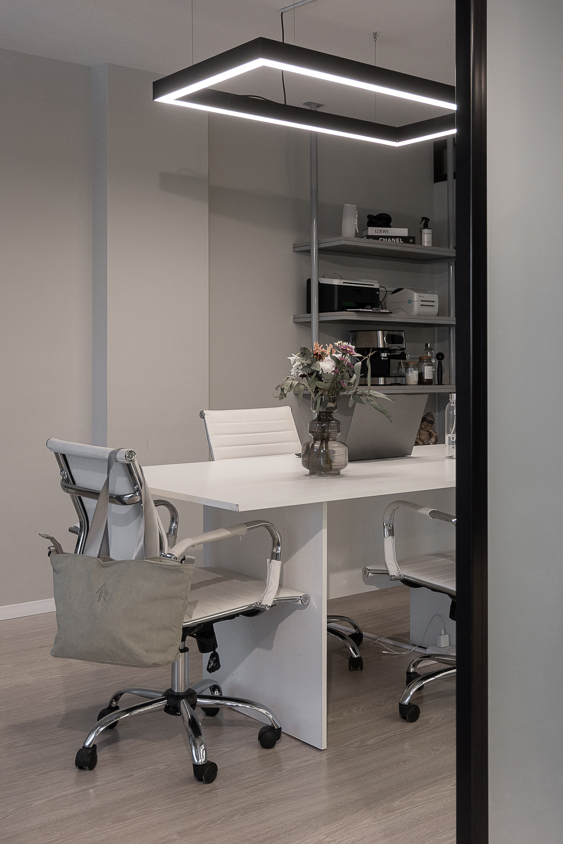Finalmente, diseñamos una oficina cómoda y funcional para seis personas, que incluye un puesto específico para la diseñadora de carteras y un rincón versátil para fotografía de producto.