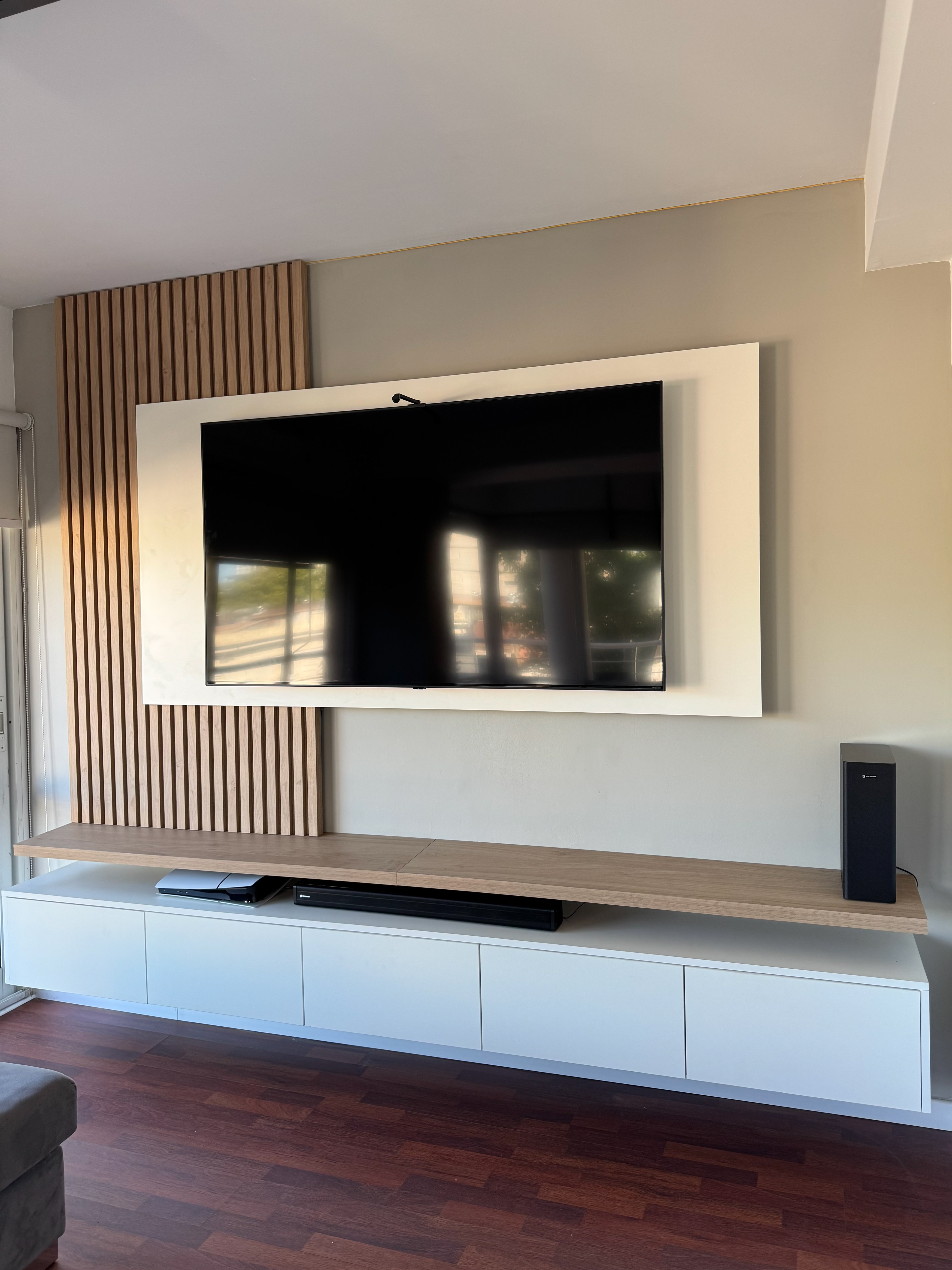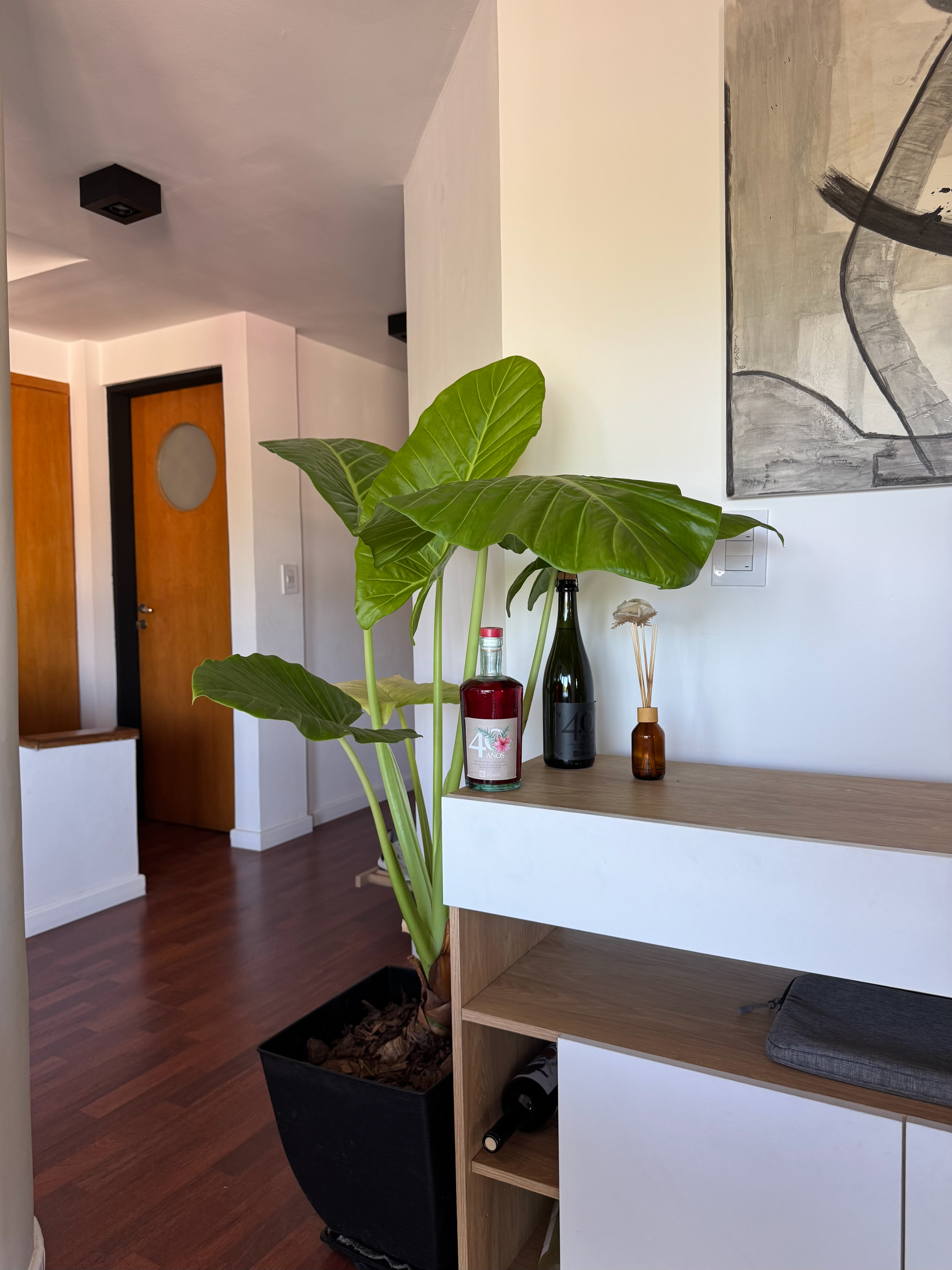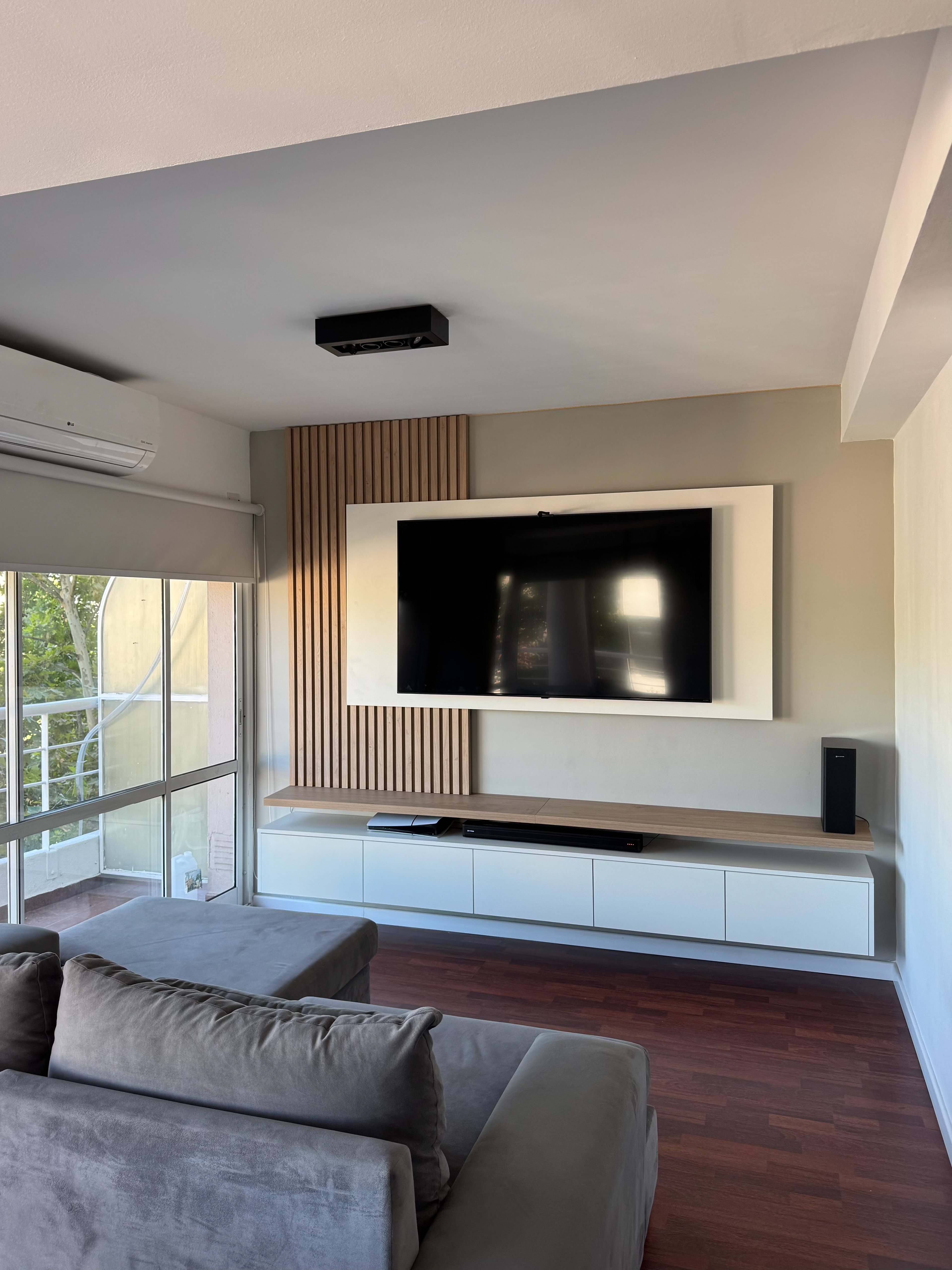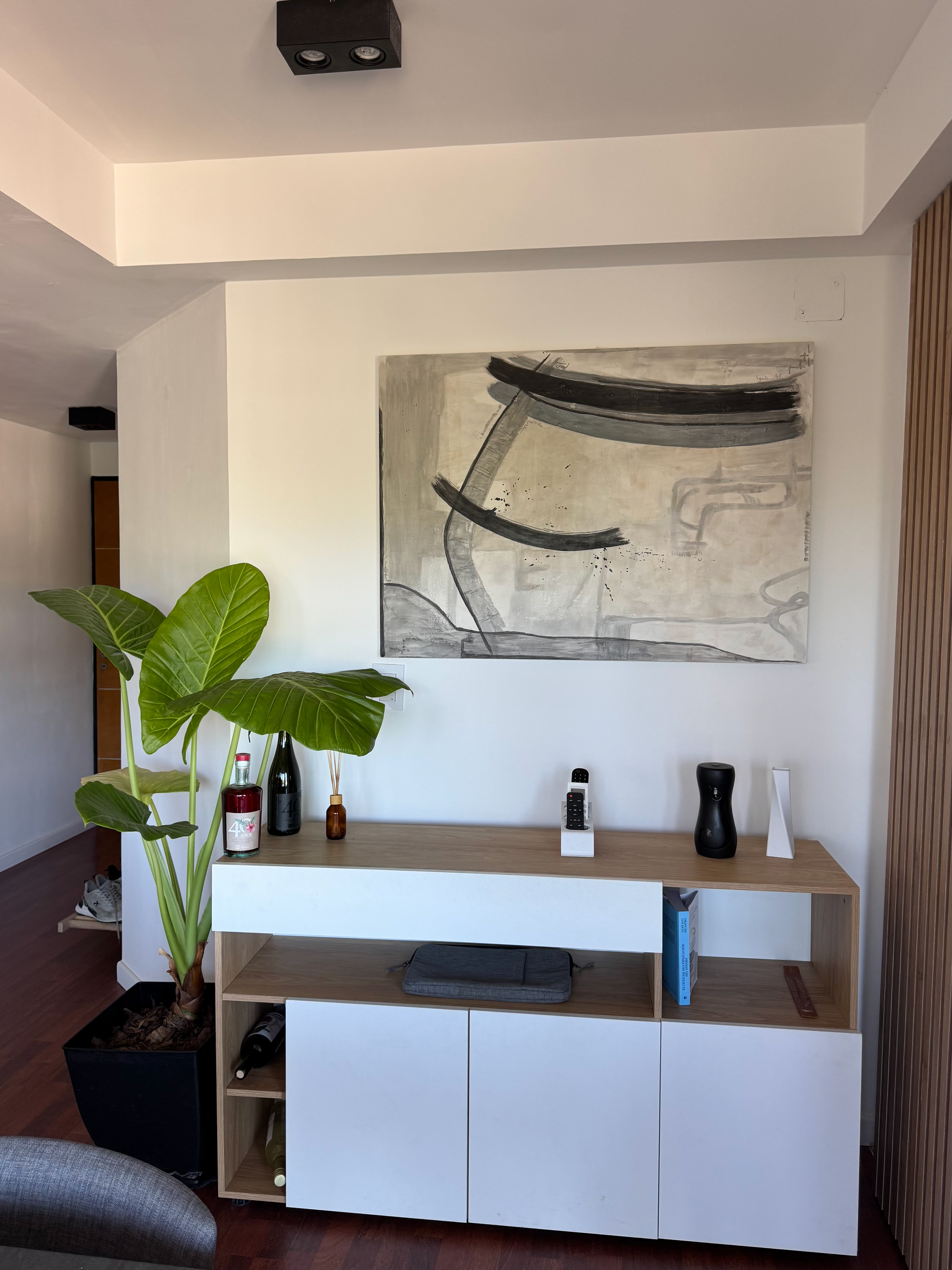 Para la remodelación de la planta baja, decidimos principalmente realizar un cambio de pisos, optando por un revestimiento de PVC en todos los ambientes, excepto en la cocina, donde se instaló un porcelanato gris. Las paredes se dejaron en color blanco, a excepción de la pared del rack y las dos columnas, las cuales se pintaron de gris para resaltar.