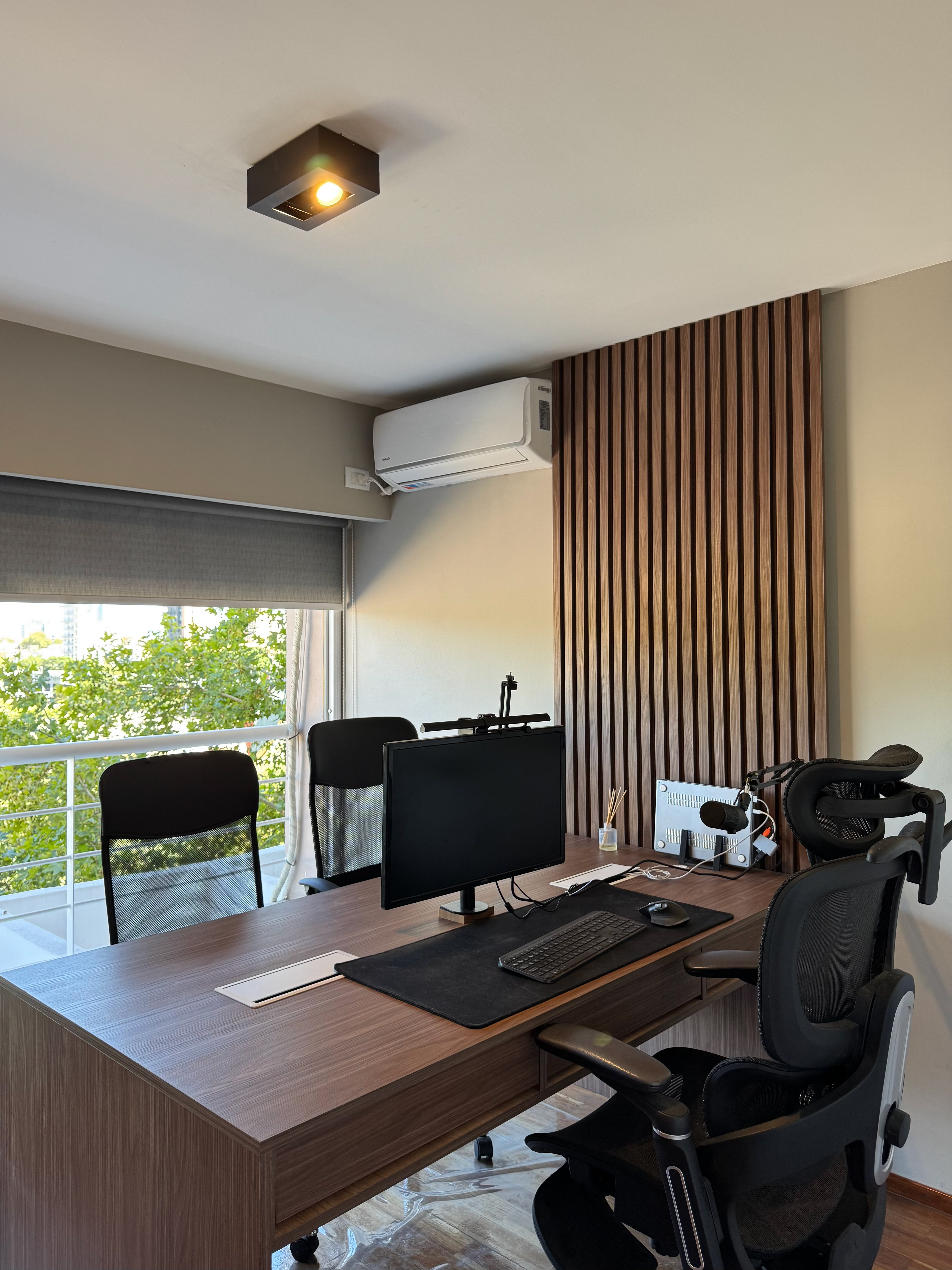 En la planta alta, el sector mas privado, en la primera habitación, se diseñó un área de trabajo con paredes grises, un escritorio, cuatro sillas y un televisor y por ultimo, el mueble de almacenamiento se pintó de blanco y colocamos cortinas roller translucidas.