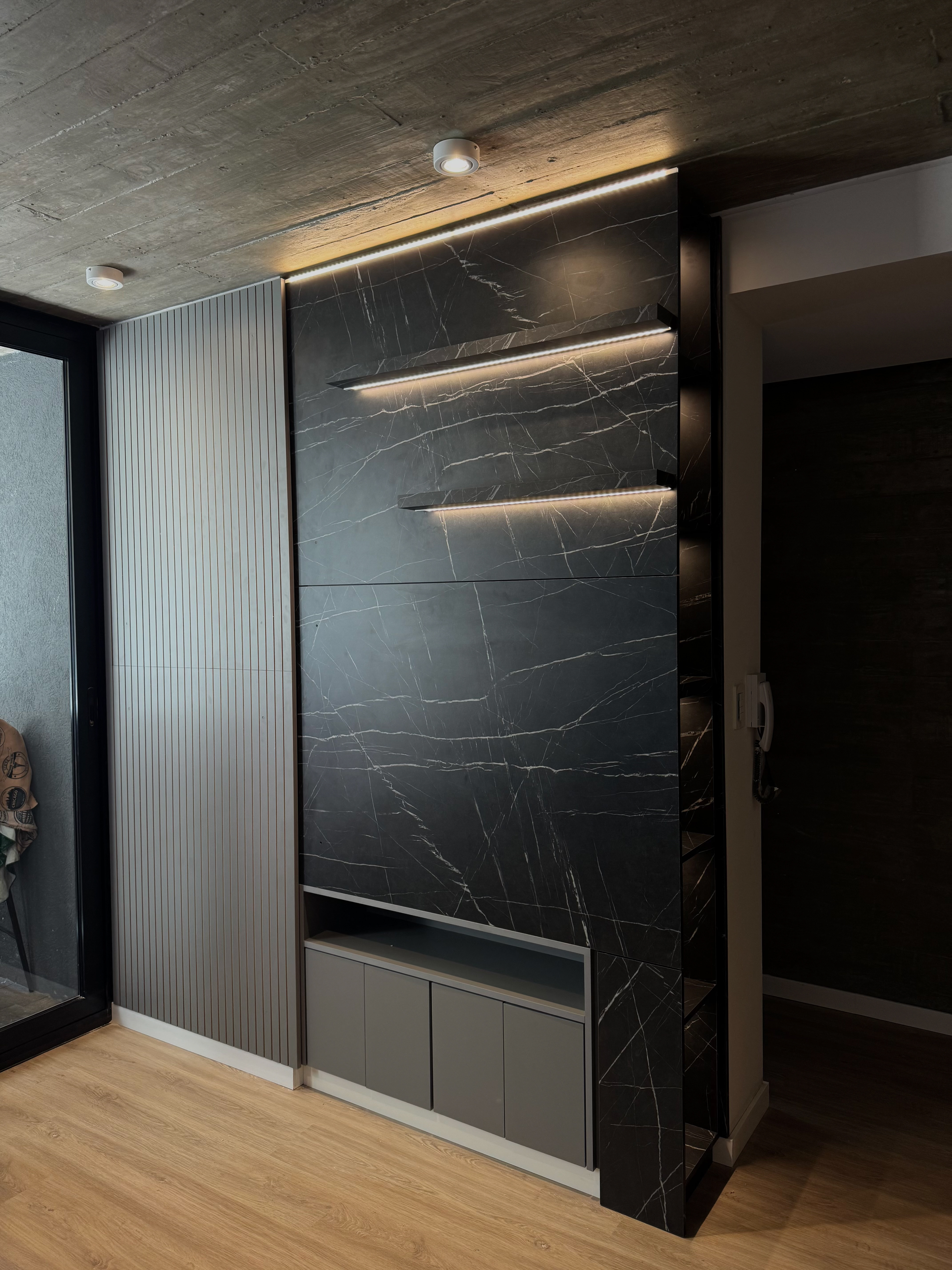 Este rack de TV fue diseñado con el objetivo de unificar los dos muros existentes, logrando una estructura lineal y armónica. Su estética moderna combina tonos de gris y negro, integrándose perfectamente con la paleta del departamento. La fusión de materiales y líneas limpias aporta sofisticación y funcionalidad, creando un espacio equilibrado y visualmente ordenado.