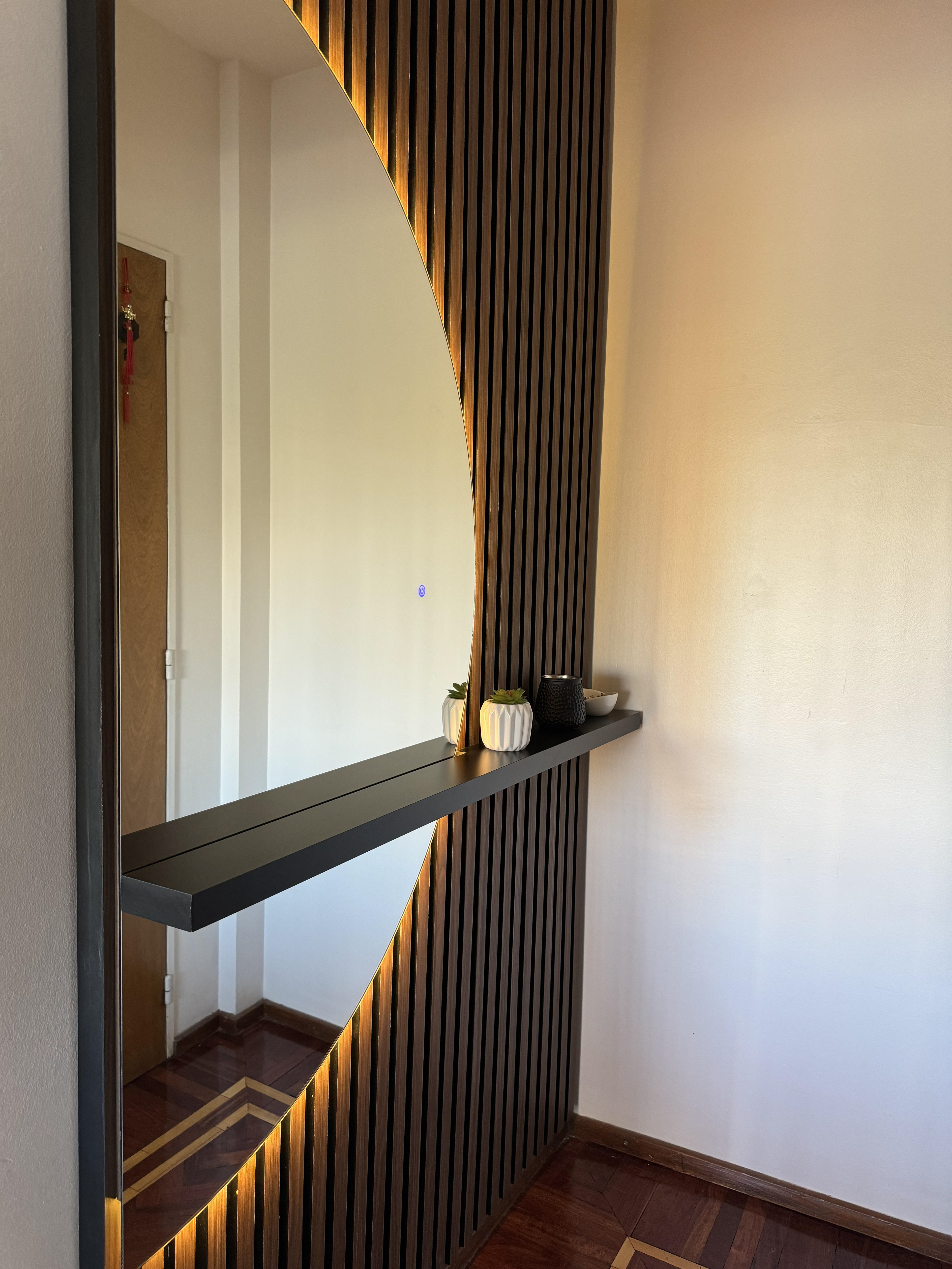 Recibidor con varillas de melamina, estante flotante y medio espejo con luz led dimerizable.