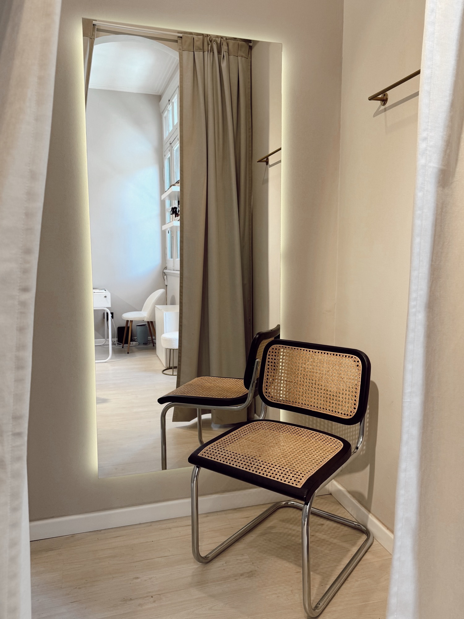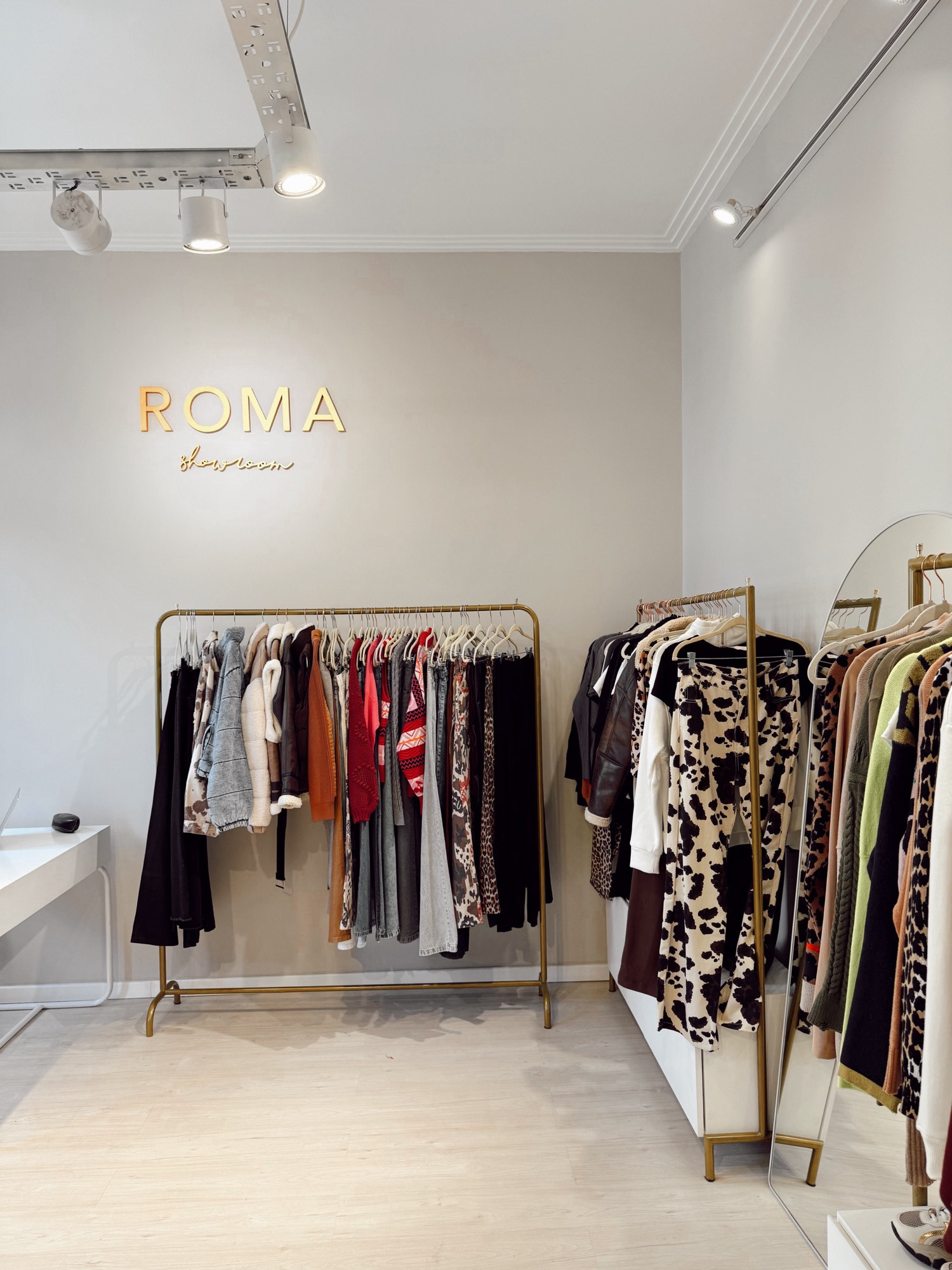 La remodelación del showroom buscó potenciar la experiencia de compra desde una estética limpia y funcional. Se trabajó con una paleta neutra para resaltar el producto, incorporando mobiliario de líneas puras, estructura metálica en dorado mate y detalles en curvas que aportan calidez. La iluminación puntual y direccionada realza texturas y colores, mientras que el probador, con cortinas pesadas y espejo retroiluminado, brinda un sector íntimo y elegante. El resultado es un espacio armónico, contemporáneo y adaptable al ritmo de una marca en constante movimiento.