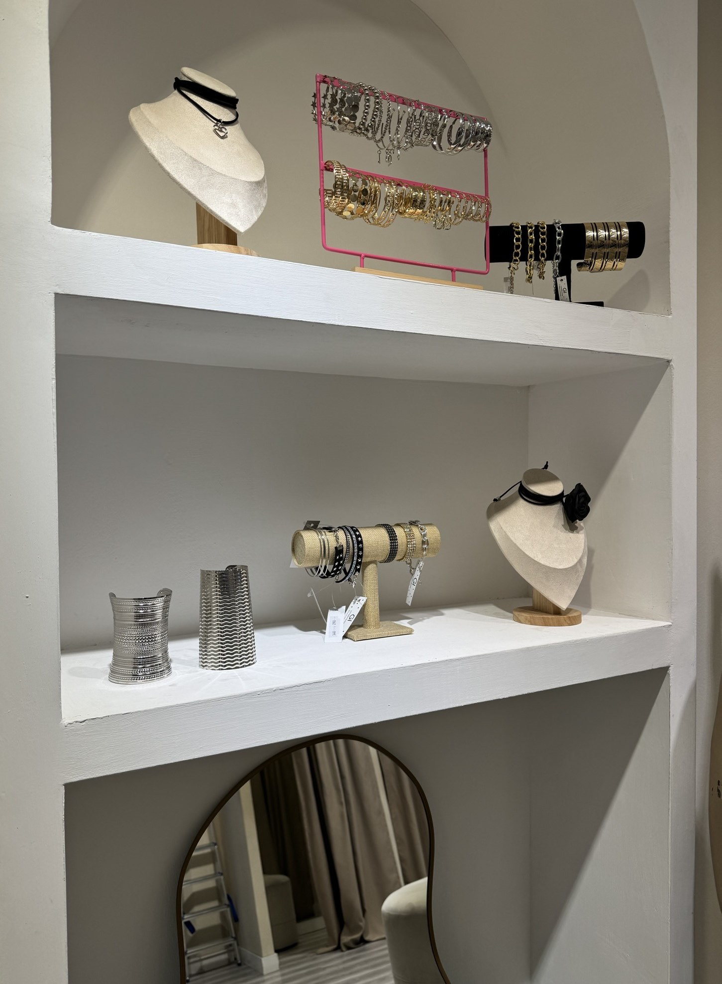 En el área central, se diseñaron exhibidores suspendidos desde el techo, creando un atractivo visual mientras optimizamos el espacio. Además, se incluyeron puff con mesas para facilitar la organización y el doblado de la mercadería. Finalmente, se habilitó un área específica para la exhibición de accesorios, logrando una disposición más ordenada y coherente con la estética general del local.