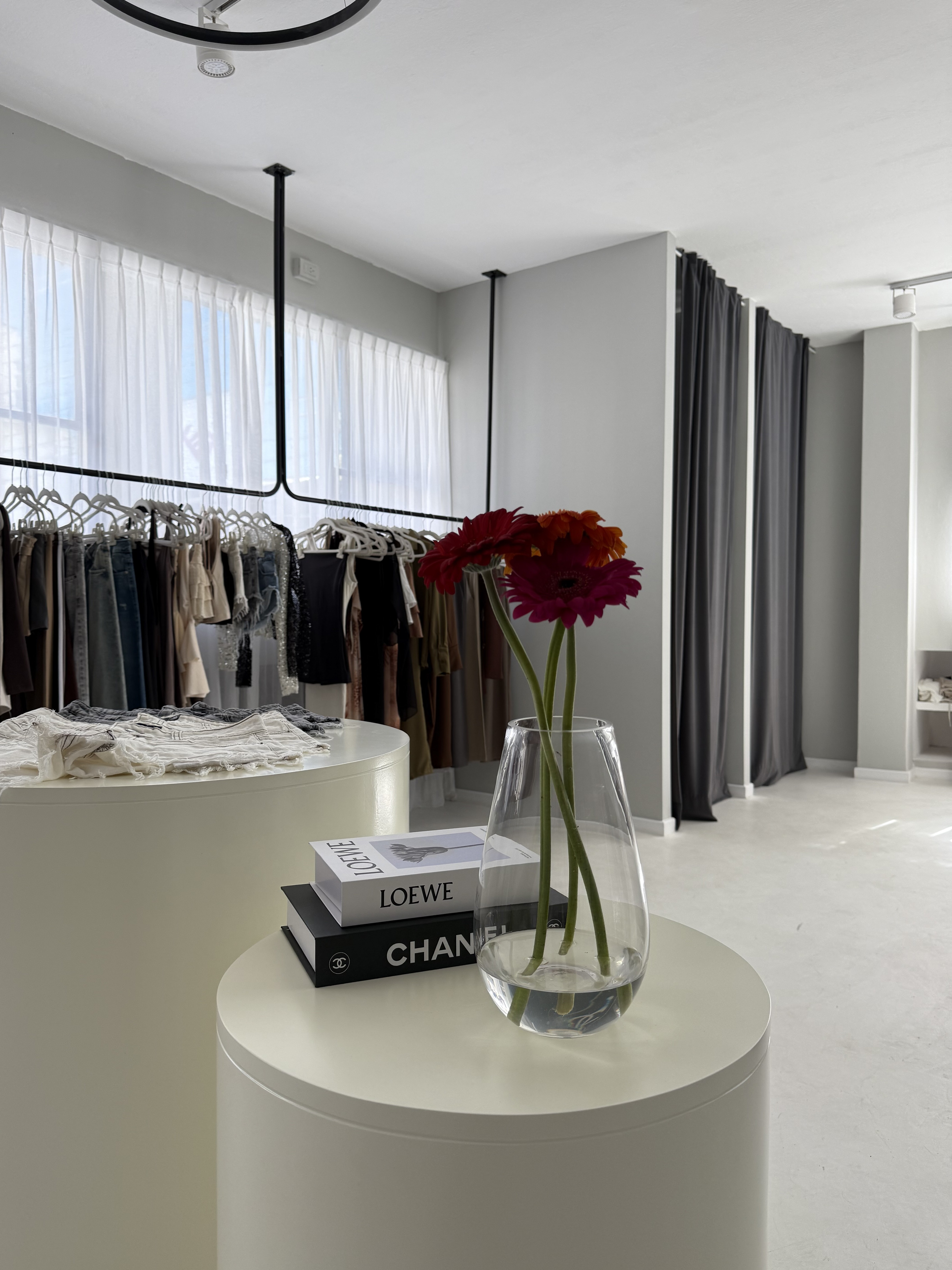 El espacio se organizó estratégicamente para asegurar circulación fluida y una lectura clara de cada sector: exhibición, probadores, área de descanso y sector de caja. Se incorporaron exhibidores de ropa metálicos suspendidos a medida, que generan ligereza visual y aportan carácter al local. Los probadores fueron diseñados con cortinas pesadas en tonos oscuros, iluminación cálida y espejos de cuerpo entero que estilizan y favorecen el producto en uso con tiras de led.