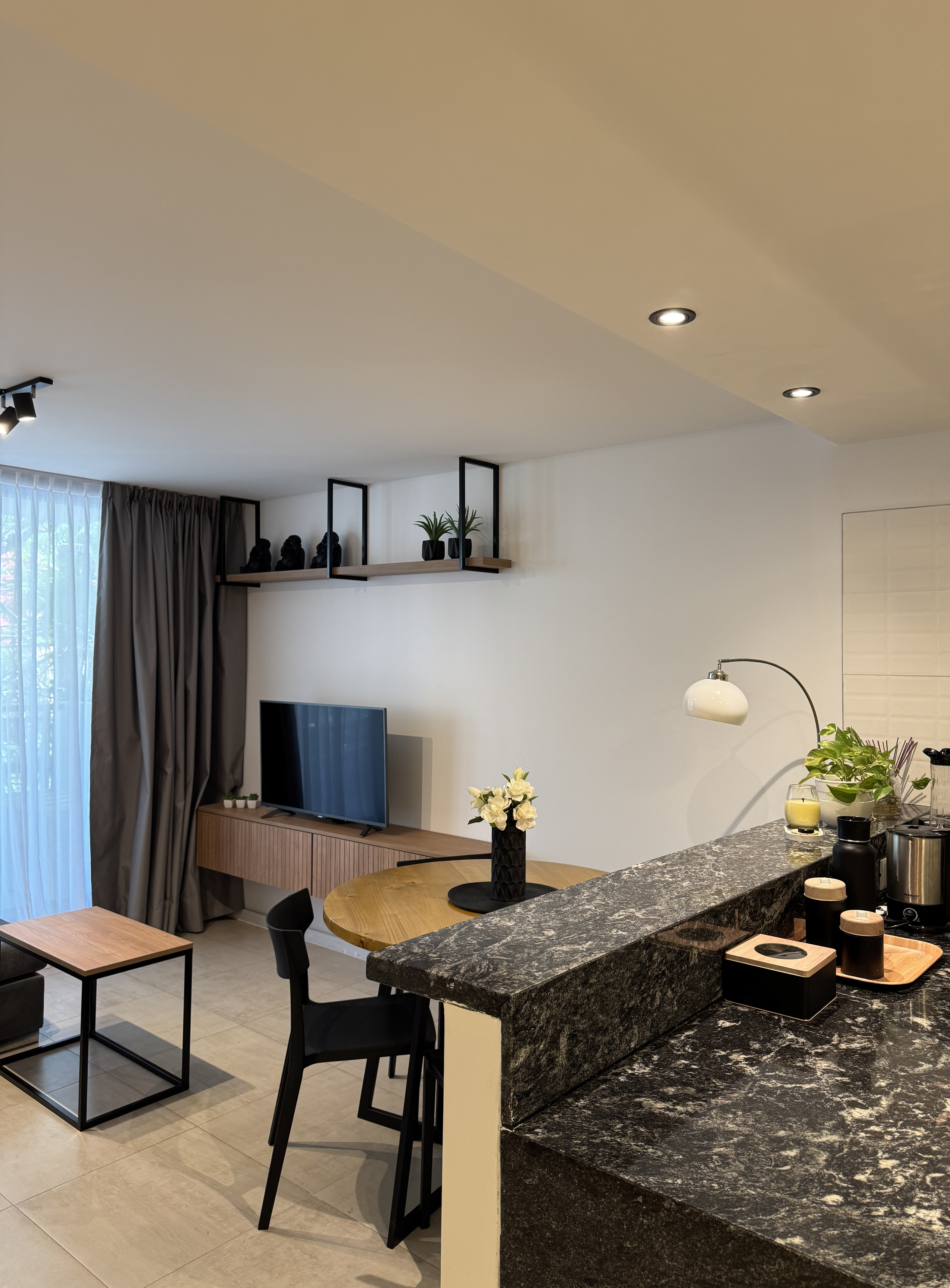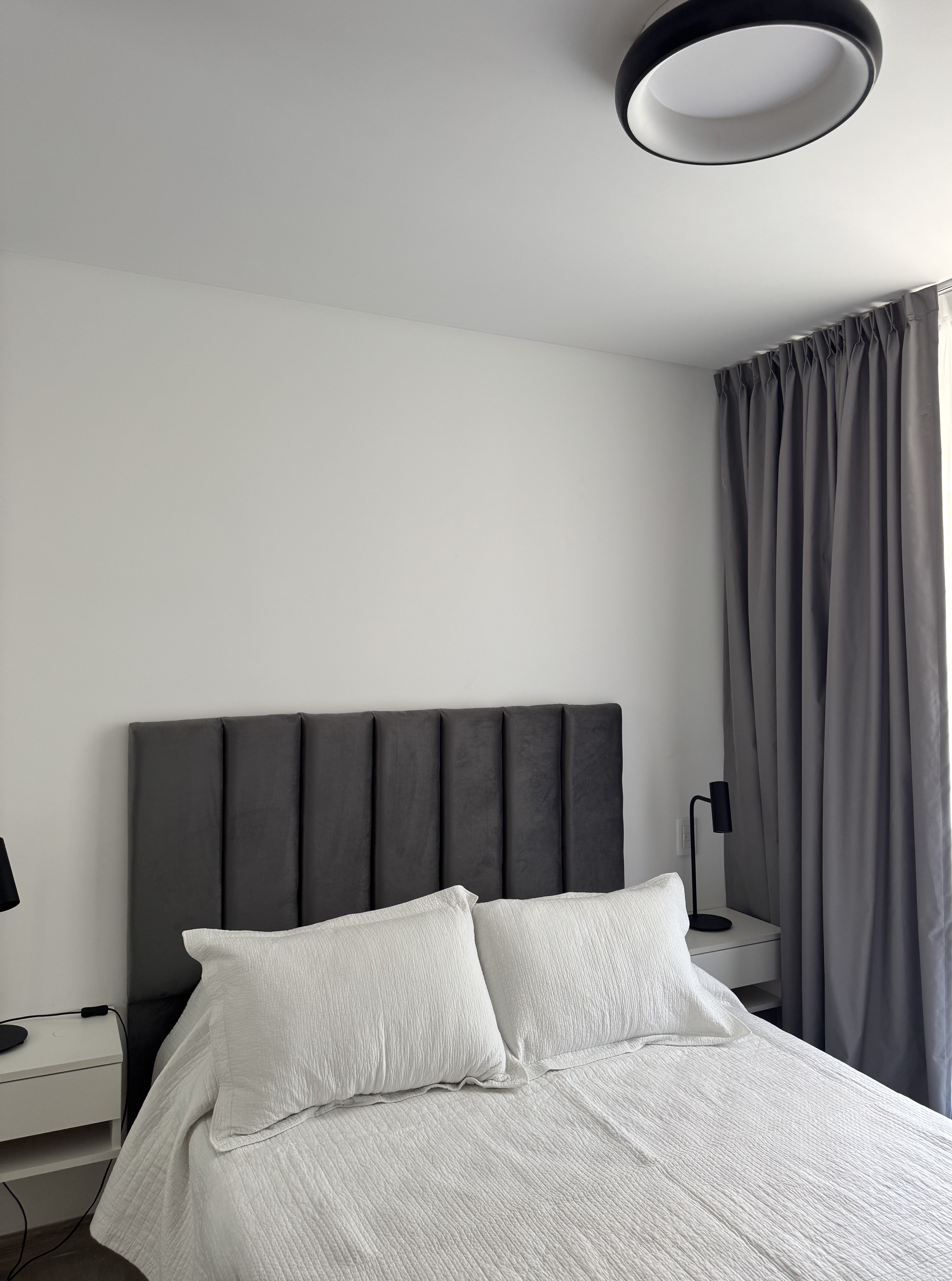 Diseñamos un departamento con un equilibrio perfecto entre funcionalidad y estilo. En la habitación, elegimos colores neutros y fuimos por un diseño sencillo. Principalmente instalamos cortinas de tela Portobello combinadas con black out para mayor privacidad y confort. Además, incorporamos un respaldar a juego con las cortinas y mesas de luz flotantes, optimizando el espacio sin perder elegancia.